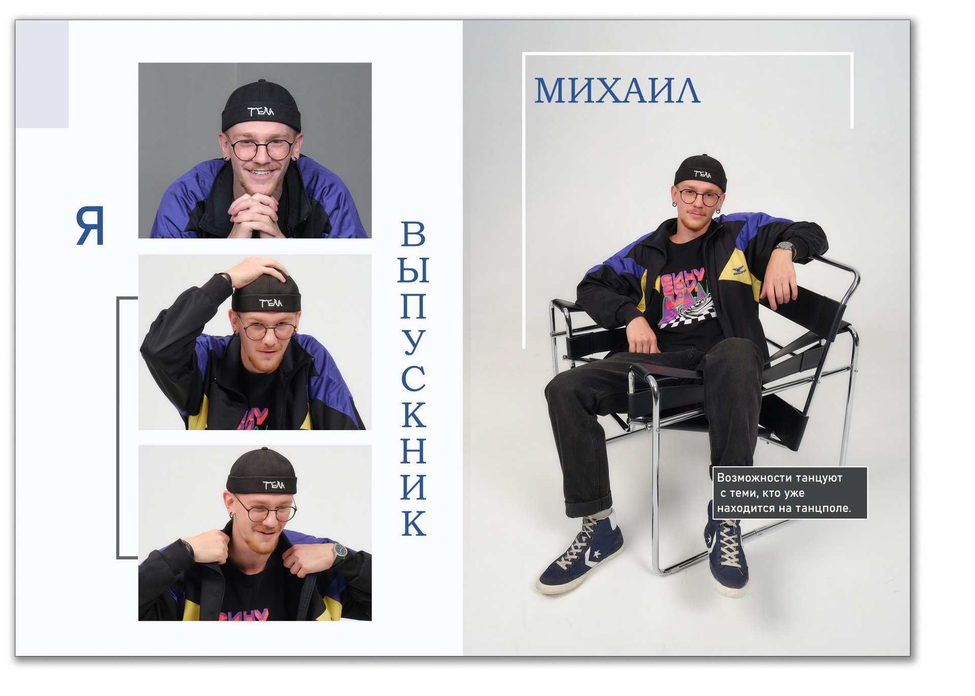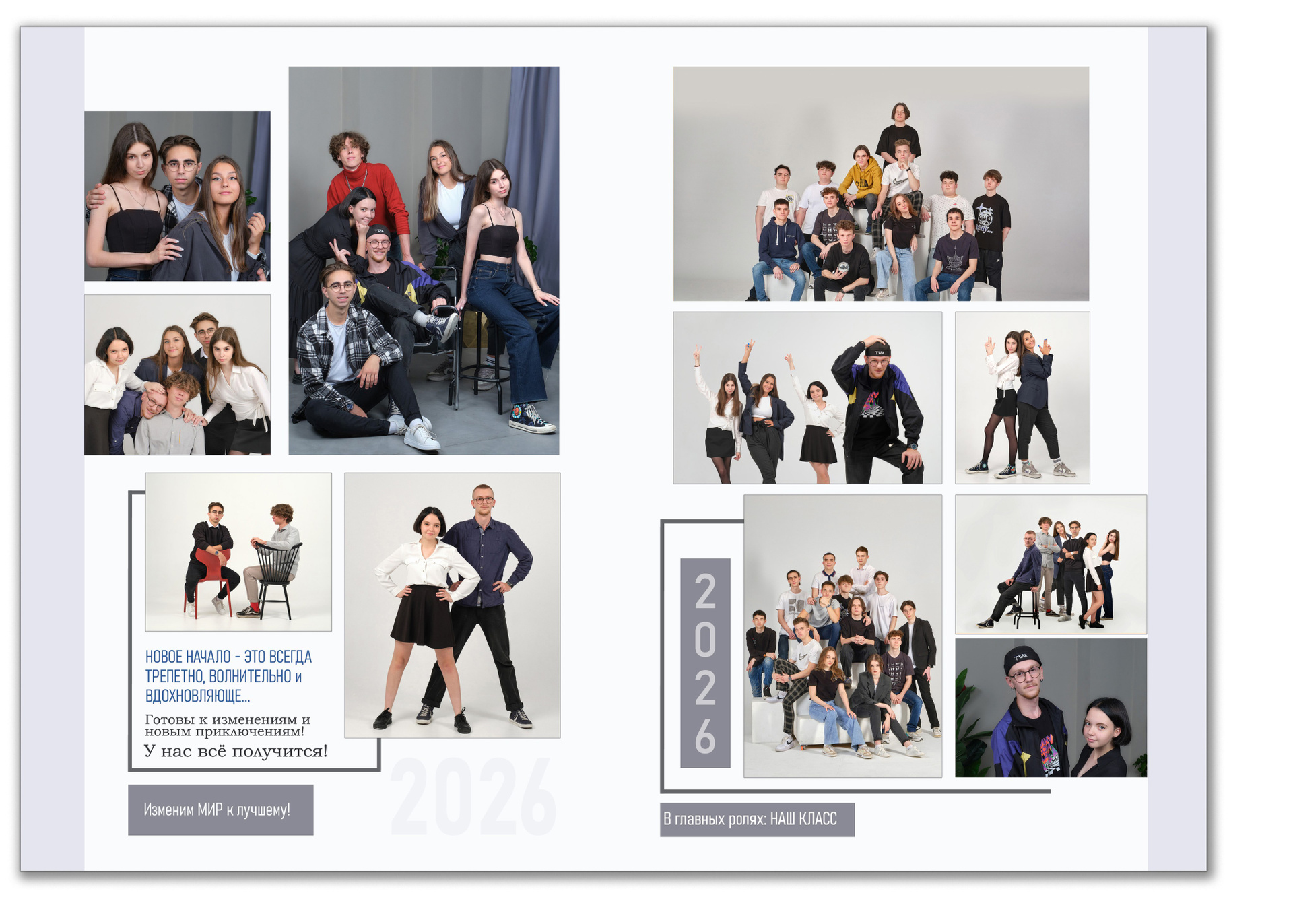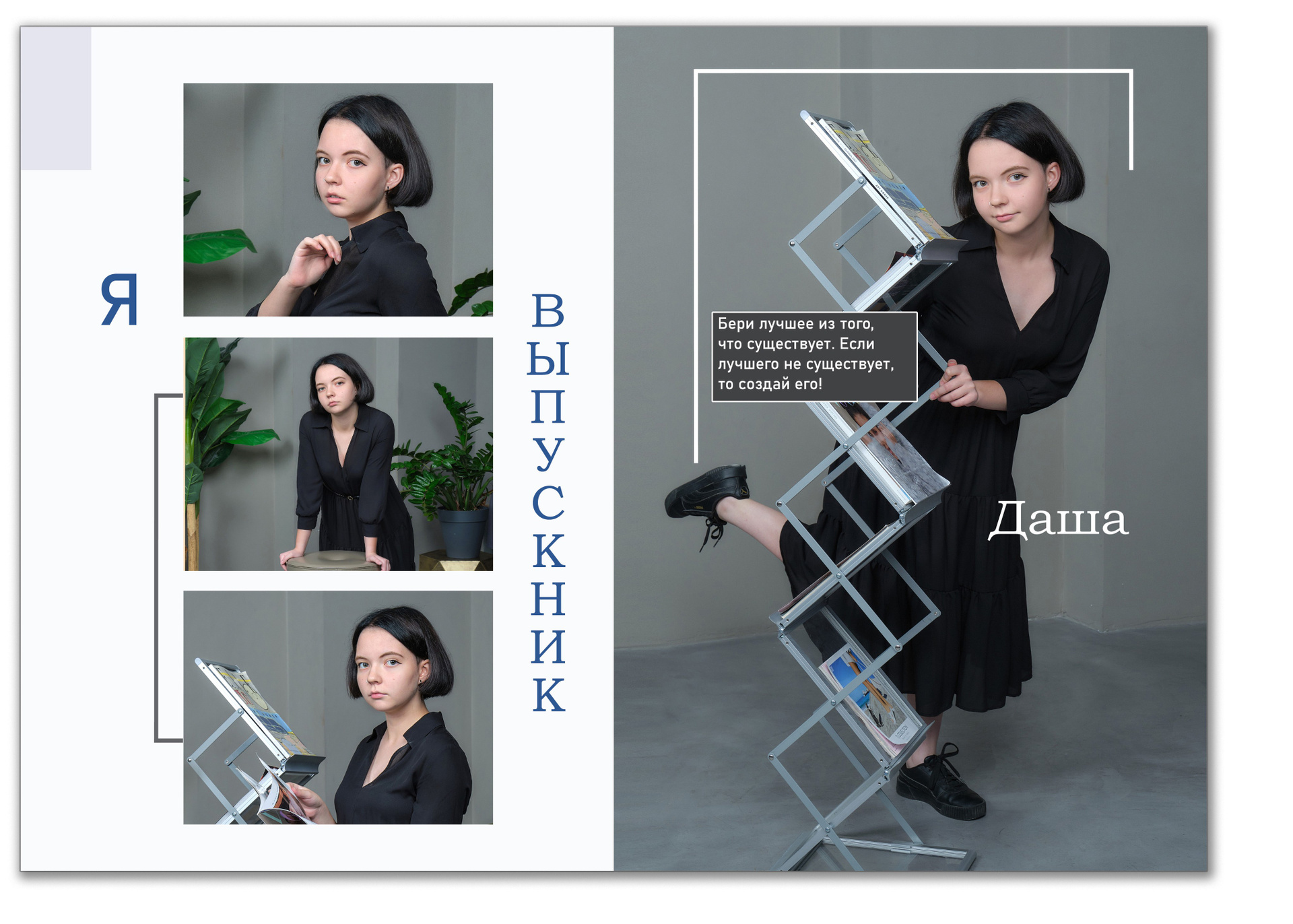 - для каждого выпускника один разворот с четырьмя портретами и цитатой, один из портретов совпадает с портретом на обложке.