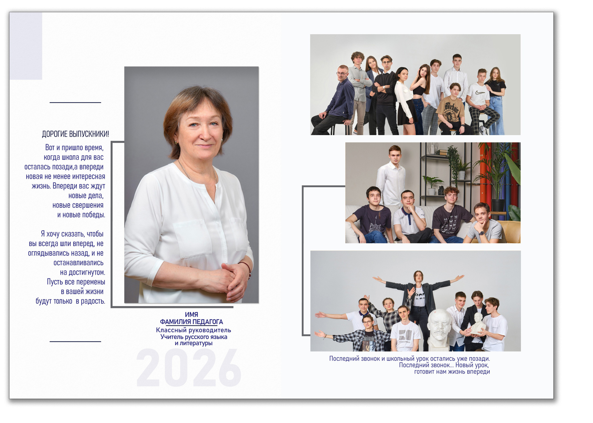 - 1 портрет учителя с пожеланием выпускникам, до 14 групповых фотографий.